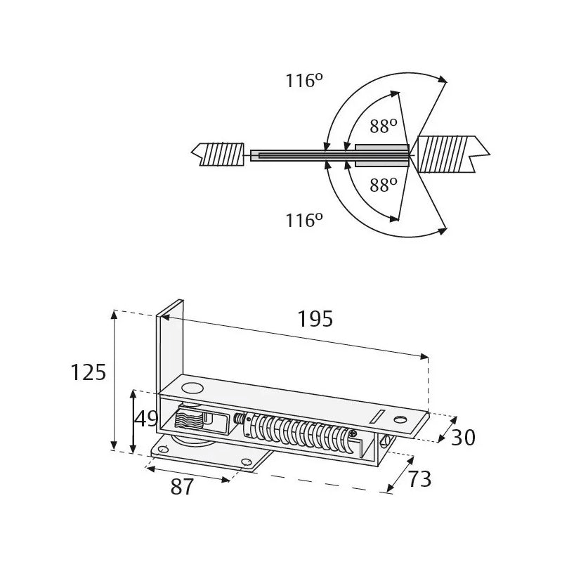 Cuenta con topes a 0°, 88° y 116° en ambas direcciones.