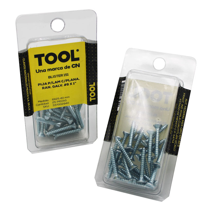 Blíster 151 Pija Para Lámina Cabeza Plana Ranurada Galvanizada #6X1" Con 25 Piezas