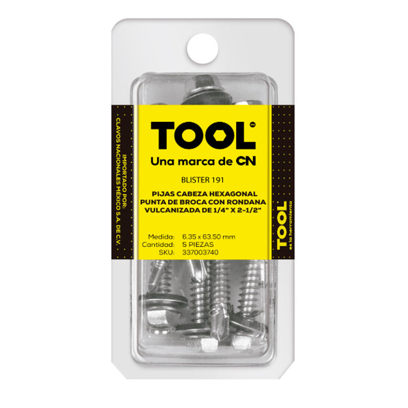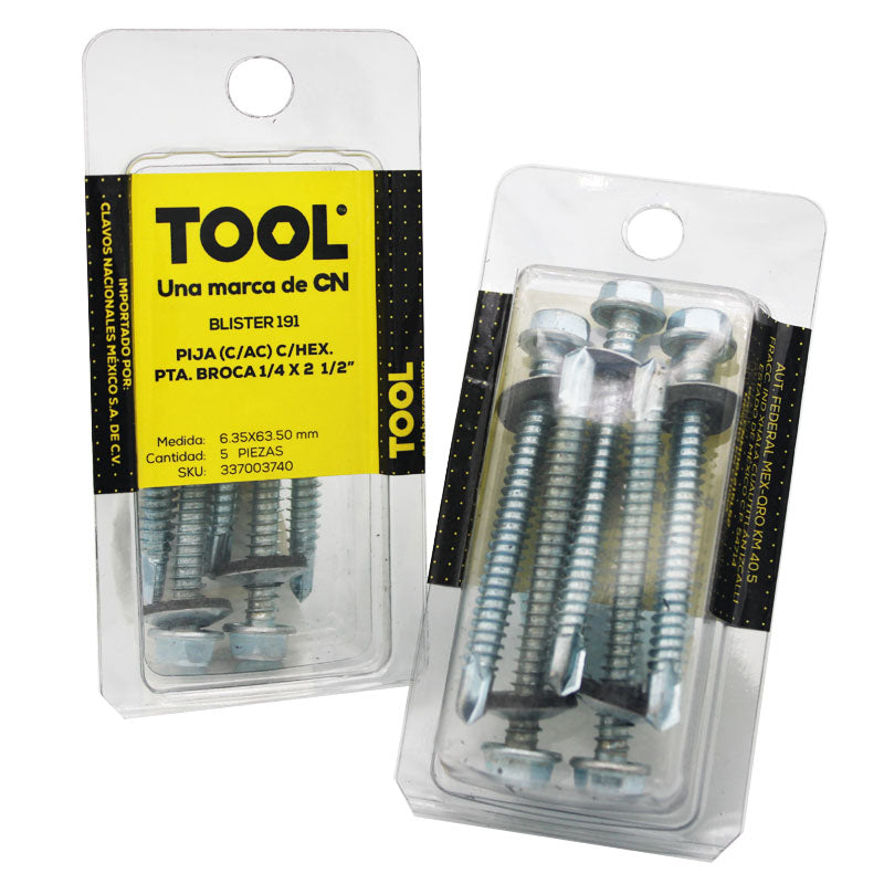 Aplicación: Ideales para fijación de uso general. ? Blister 191 Pija(C/Ac)C/Hex.Pta.Broca 1/4X2.1/2 5P