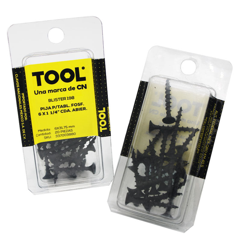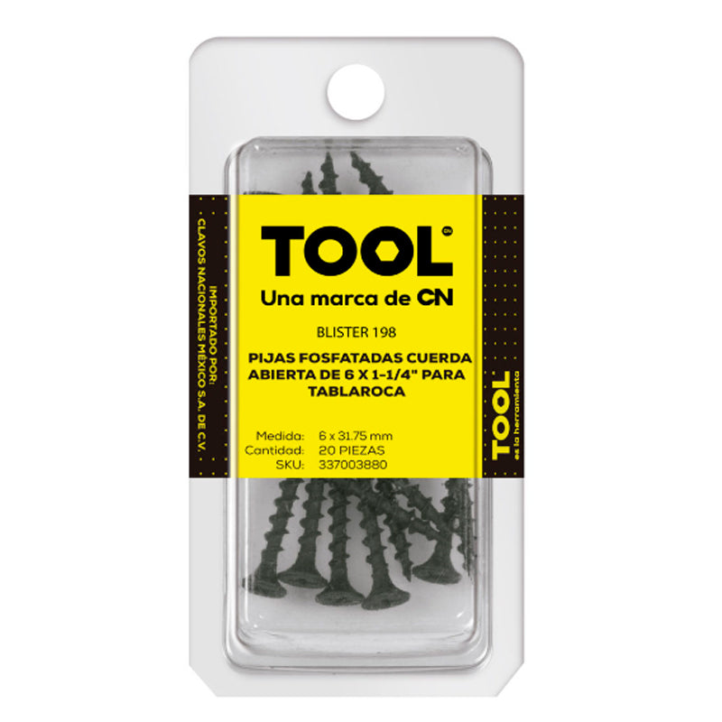 El diámetro de las roscas de los tornillos de los paneles de yeso es mayor que el diámetro de la empuñadura. Los tornillos para paneles de yeso tienen roscas más profundas que los tornillos normales, lo que evita que se desprendan fácilmente del panel de yeso. Están hechos de acero y requieren un destornillador eléctrico para perforarlos en el panel de yeso. Además, los tornillos para paneles de yeso se emplean a menudo junto con anclajes de plástico que ayudan a distribuir el peso del objeto colgado de manera uniforme sobre la superficie. ? Blister 198 Pija P/Tablaroca 6X1.1/4" Abierta 20Pz