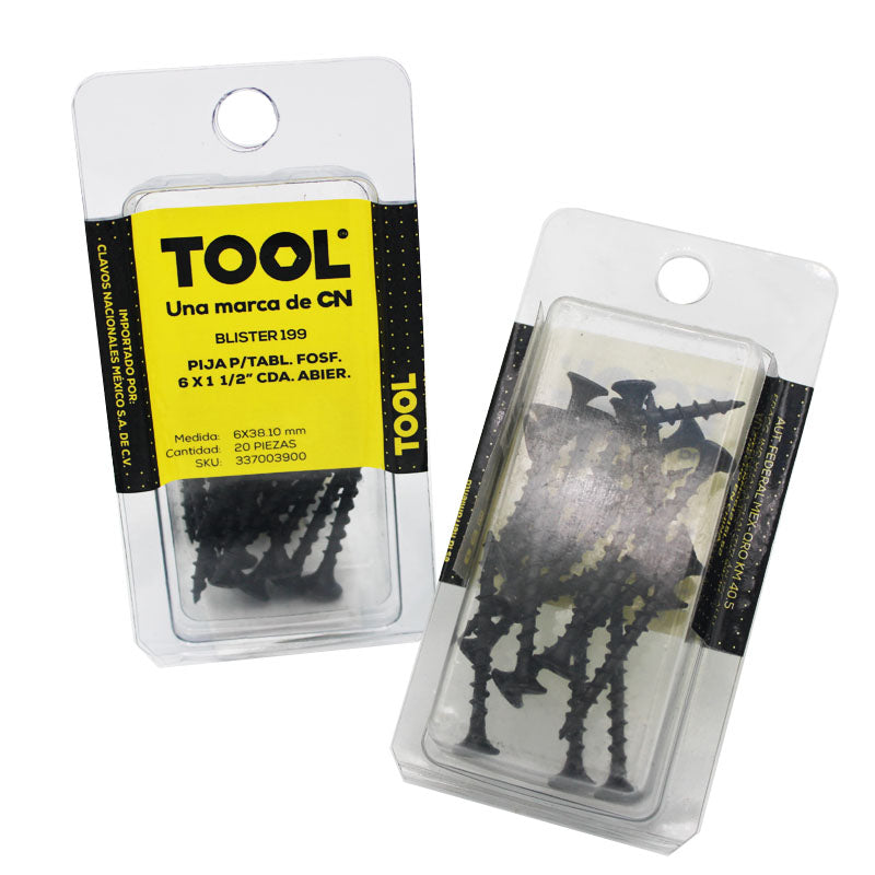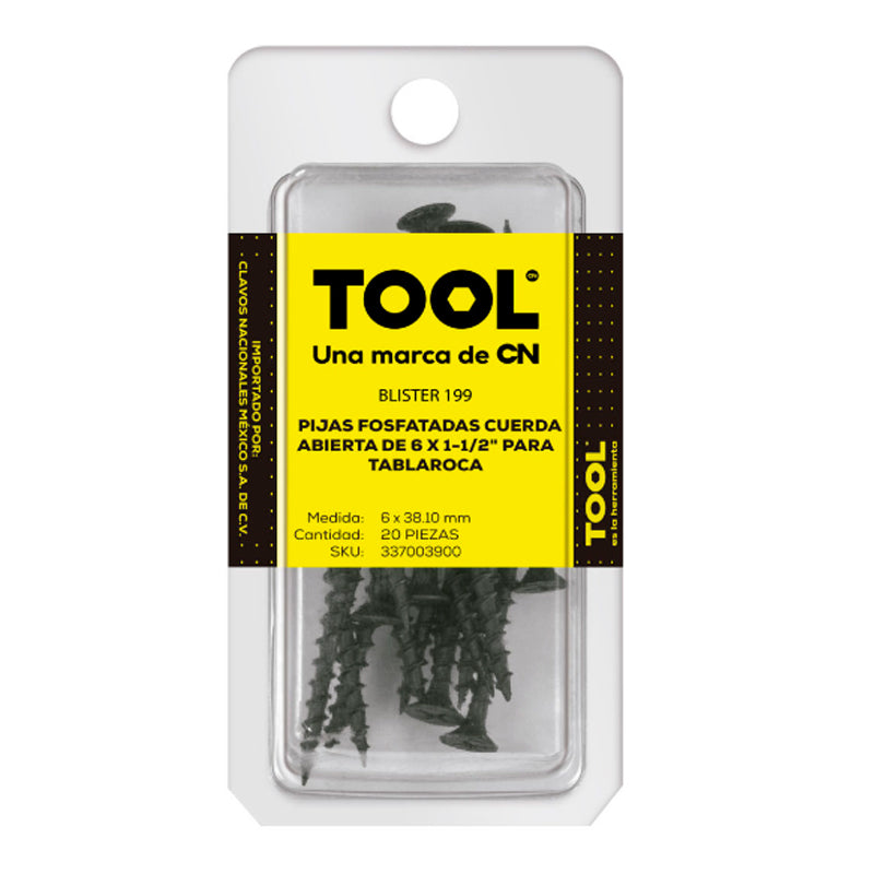 El diámetro de las roscas de los tornillos de los paneles de yeso es mayor que el diámetro de la empuñadura. Los tornillos para paneles de yeso tienen roscas más profundas que los tornillos normales, lo que evita que se desprendan fácilmente del panel de yeso. Están hechos de acero y requieren un destornillador eléctrico para perforarlos en el panel de yeso. Además, los tornillos para paneles de yeso se emplean a menudo junto con anclajes de plástico que ayudan a distribuir el peso del objeto colgado de manera uniforme sobre la superficie. ? Blister 199 Pija P/Tablaroca 6X1.1/2" Abierta 20Pz