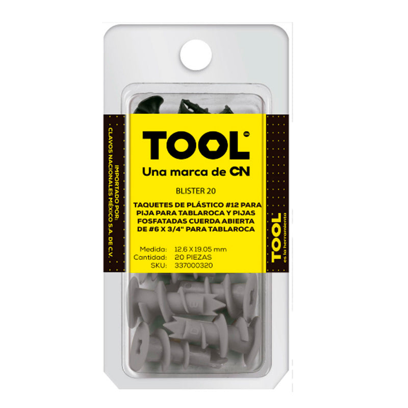 El diámetro de las roscas de los tornillos de los paneles de yeso es mayor que el diámetro de la empuñadura. Los tornillos para paneles de yeso tienen roscas más profundas que los tornillos normales, lo que evita que se desprendan fácilmente del panel de yeso. Están hechos de acero y requieren un destornillador eléctrico para perforarlos en el panel de yeso. Además, los tornillos para paneles de yeso se emplean a menudo junto con anclajes de plástico que ayudan a distribuir el peso del objeto colgado de manera uniforme sobre la superficie. ? Blister 20 Taquete Plast.#12 Y Pijac/A 6X3/4 20Pz