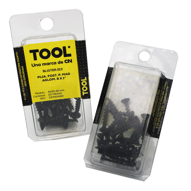 El diámetro de las roscas de los tornillos de los paneles de yeso es mayor que el diámetro de la empuñadura. Los tornillos para paneles de yeso tienen roscas más profundas que los tornillos normales, lo que evita que se desprendan fácilmente del panel de yeso. Están hechos de acero y requieren un destornillador eléctrico para perforarlos en el panel de yeso. Además, los tornillos para paneles de yeso se emplean a menudo junto con anclajes de plástico que ayudan a distribuir el peso del objeto colgado de manera uniforme sobre la superficie. ? Blister 213 Pija.Fost.P.Mad Aglom. 8X1"C/25Pzas