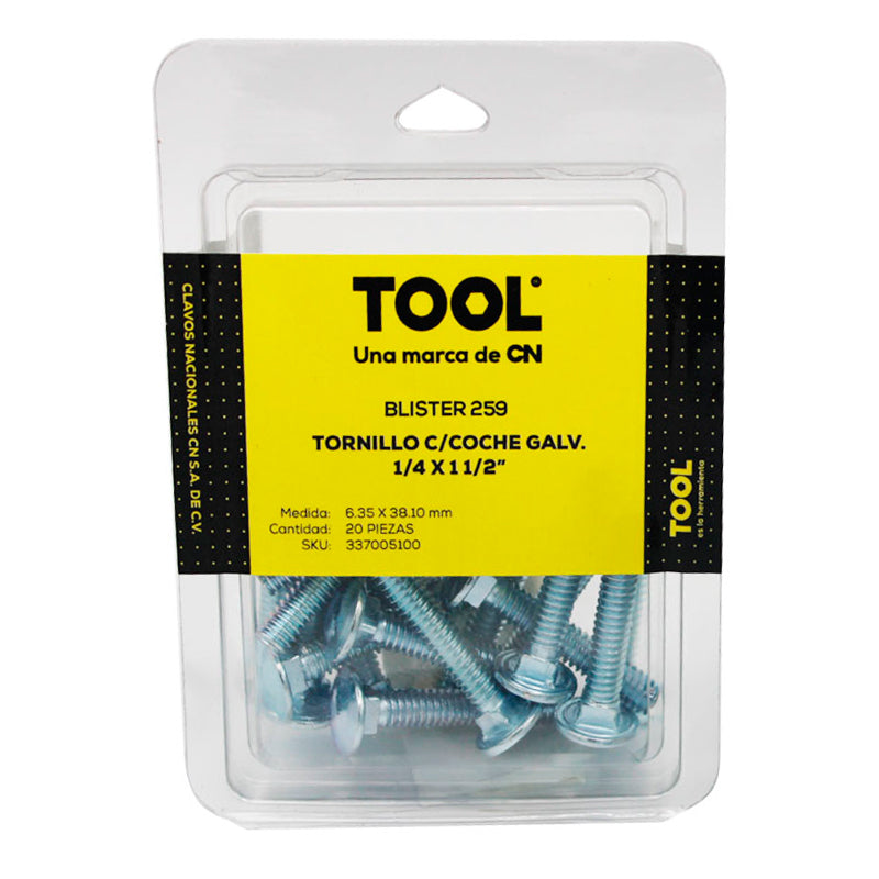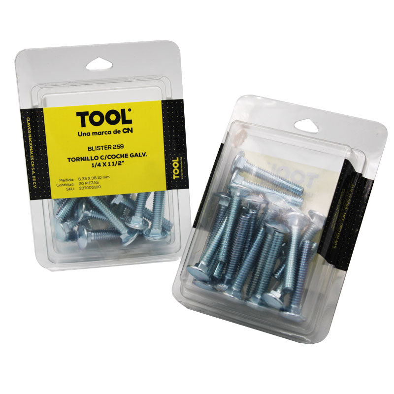 Blíster 259 Tornillo Cabeza Coche Galvanizado 1/4"X1 1/2" Con 20 Piezas