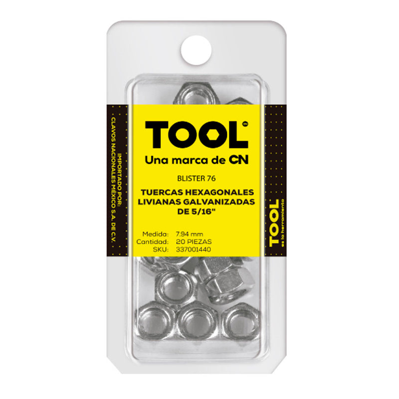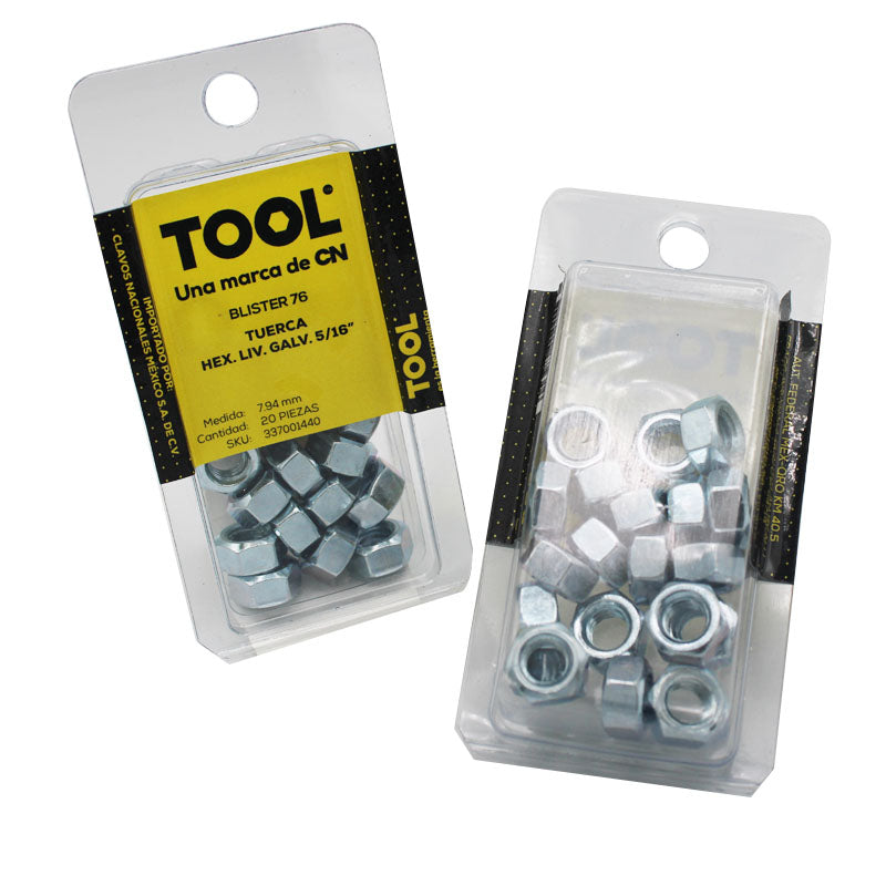 Blíster 76 Tuerca Hexagonal Liviana Galvanizada 5/16"Con 20 Piezas