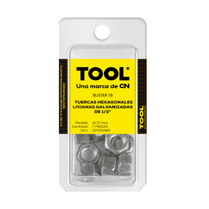 Blíster 78 Tuerca Hexagonal Liviana Galvanizada 1/2" Con 7 Piezas