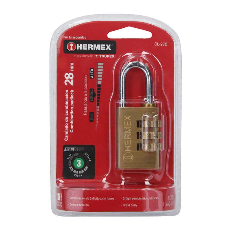 Candado de combinación 28 mm cuerpo de latón en blíster, Hermex