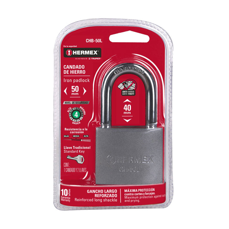 Candado de hierro 50 mm gancho largo en blíster, Hermex