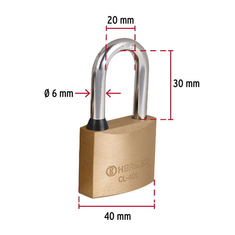 Candado de latón 40 mm gancho largo en blíster, Hermex