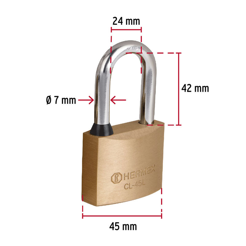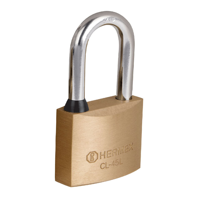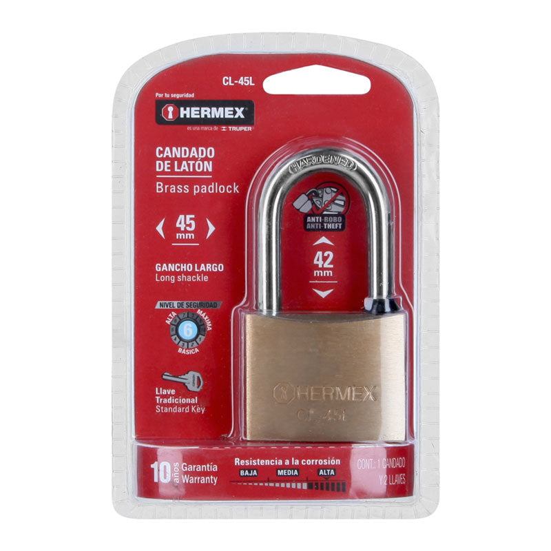 Candado de latón 45 mm gancho largo en blíster, Hermex