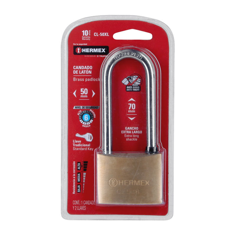 Candado de latón 50 mm gancho extra largo en blíster, Hermex