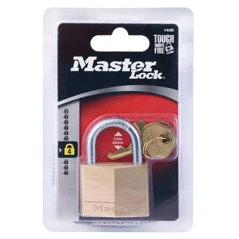 El candado Master Lock No. 140D de cuerpo sólido, tiene un cuerpo de latón sólido de 1-9/16" (40 mm) de ancho, que es fuerte, duradero y resistente a la corrosión. El arco de 1/4" (6mm) de diámetro tiene 7/8" (22mm) de largo y es de acero endurecido, lo que ofrece una mayor resistencia a los cortes y cortes con sierra. El cilindro de 4 pines impide que se quite y las palancas de bloqueo doble ofrecen resistencia contra las intrusiones y los martillazos.