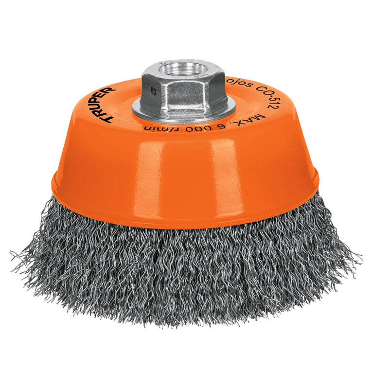 Carda copa 5" alambre ondulado fino, eje 5/8"-11, Truper