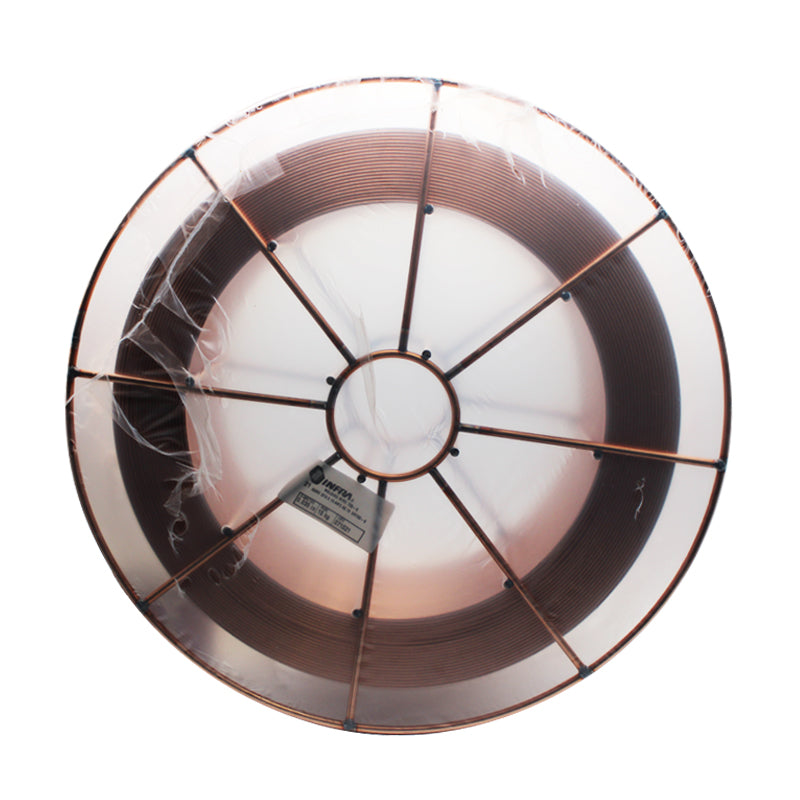 Microalambre sólido de acero al carbono con manganeso y silicio cubierto de una fina película de cobre que previene la oxidación y facilita la transferencia eléctrica en el material.