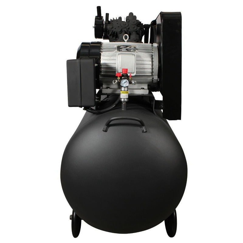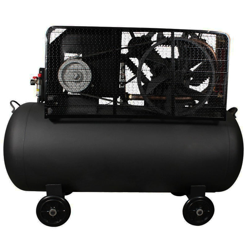 Fabricado en acero reforzado con acabado en pintura electrostática para evitar la corrosión, ruedas que facilitan su transporte, cabezal de doble pistón conectados a un sistema de poleas, banda que incrementa su eficiencia y tiempo de vida, manómetro de presión y 2 válvulas de salida.