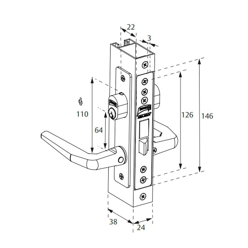 Pestillo reversible con accionamiento por medio de las manijas, para puertas que abaten hacia adentro o hacia afuera.