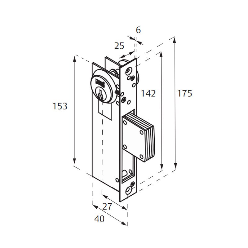 Cerrojo tipo paleta de acción giratoria formado por 5 placas de acero.