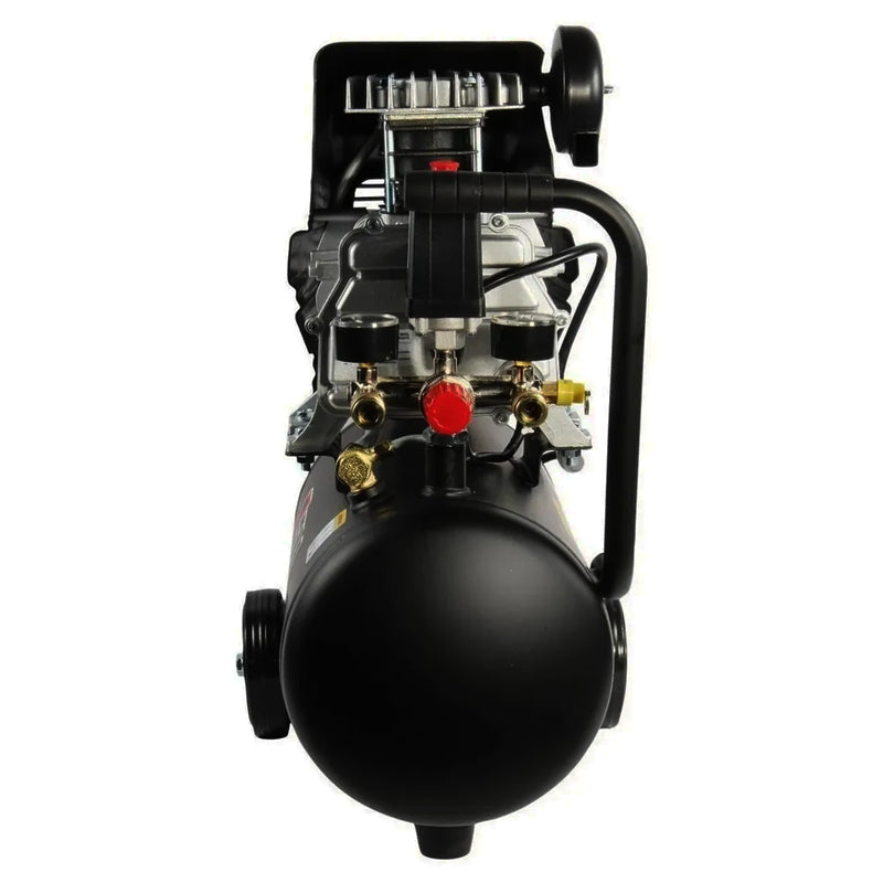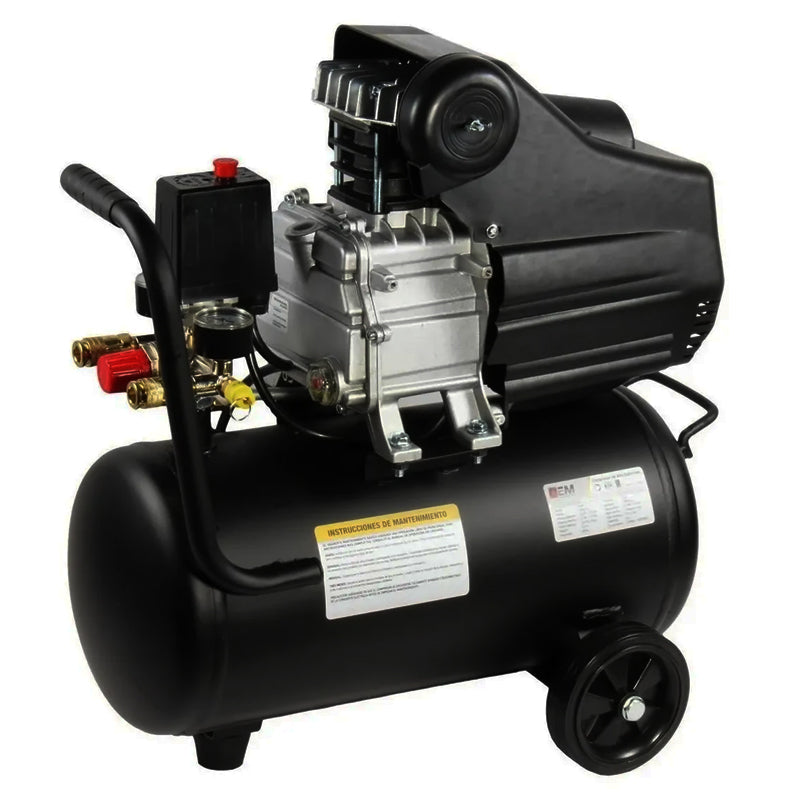 Compresor de aire con potencia de 2.5 HP y tanque con capacidad de 25 L, cuenta con embobinado de cobre, doble salida de aire, maneral soldado para moverlo con seguridad y ruedas traseras para transportarlo fácilmente.