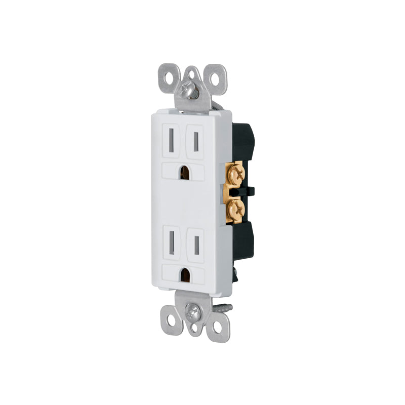 Contacto aterrizado, se caracterizan por tener tres puntos de conexión, línea neutra y de tierra física, el cual sirve como protección contra una descarga eléctrica. Contactos polarizados, tienen una ranura más ancha que la otra y de esta forma está obligado a entrar en una sola posición, para no conectarse erróneamente. Cuerpo fabricado en nylon-policarbonato. Soporte de acero galvanizado. Contactos aterrizados y polarizados.