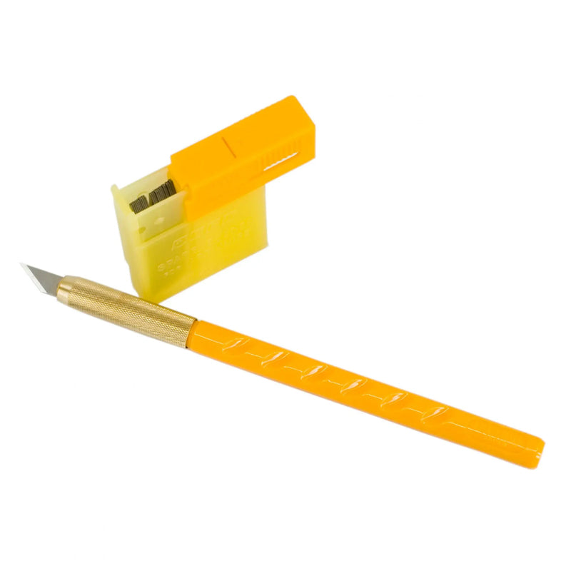 Navaja de arte estándar con mango de plástico en forma de pluma.