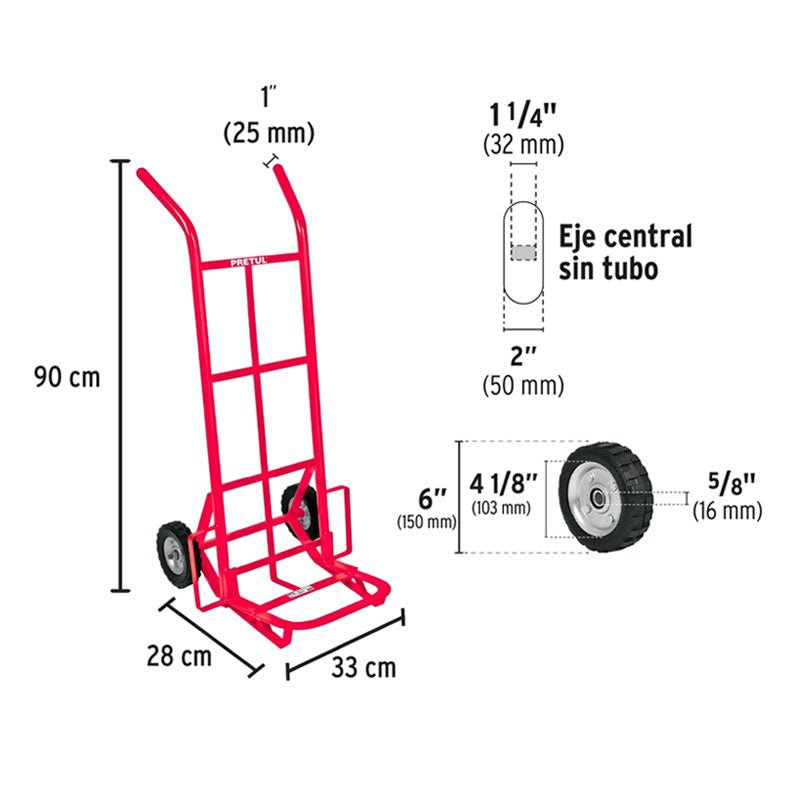 Diseñado con ruedas de hule sólido antiponchaduras de uso rudo con eje central sin tubo.