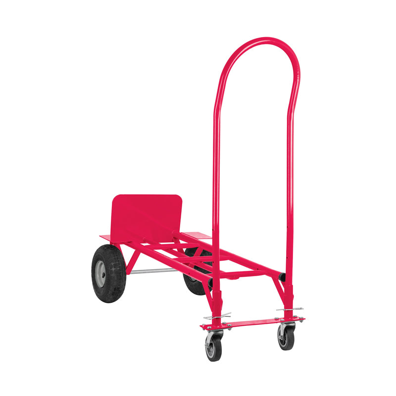 Diablo de carga con estructura tubular de acero, con dos ruedas neumáticas de caucho y dos rodajas giratorias de polipropileno, dos posiciones, diablo y plataforma. Base tipo plataforma para colocar objetos y parrillas laterales protectores para las ruedas.