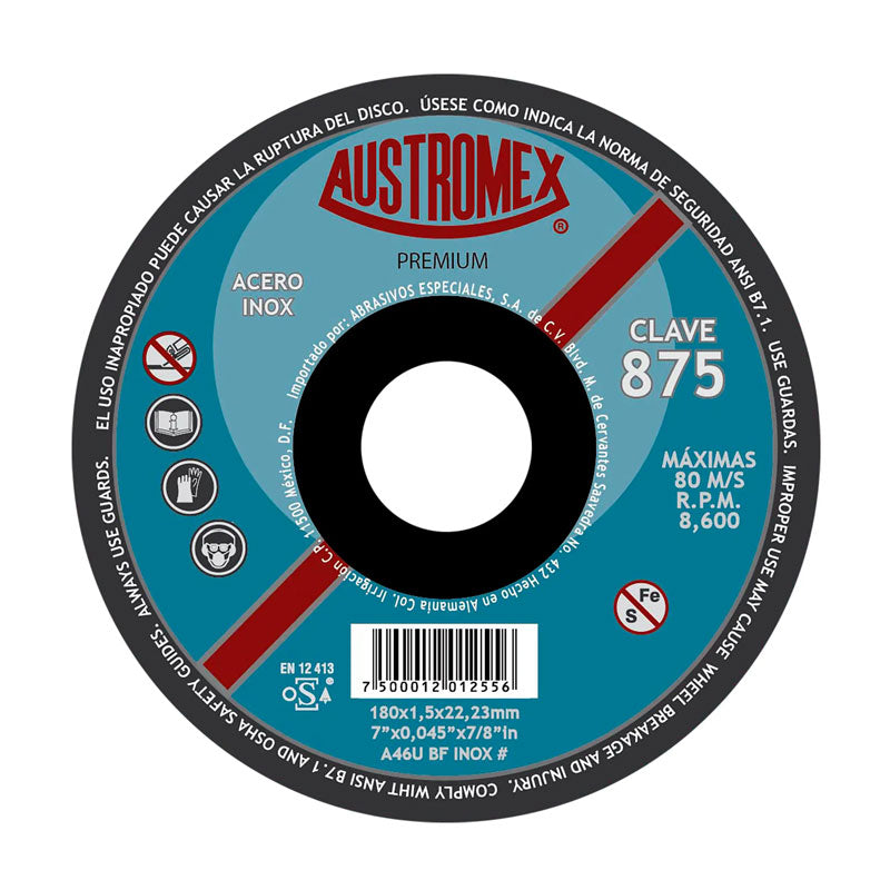 Disco abrasivo para corte de acero inoxidable de 7" x 0.045" x 7/8", Austromex