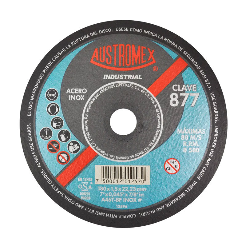 Disco abrasivo para corte de acero inoxidable de 7" x 0.045" x 7/8", Austromex