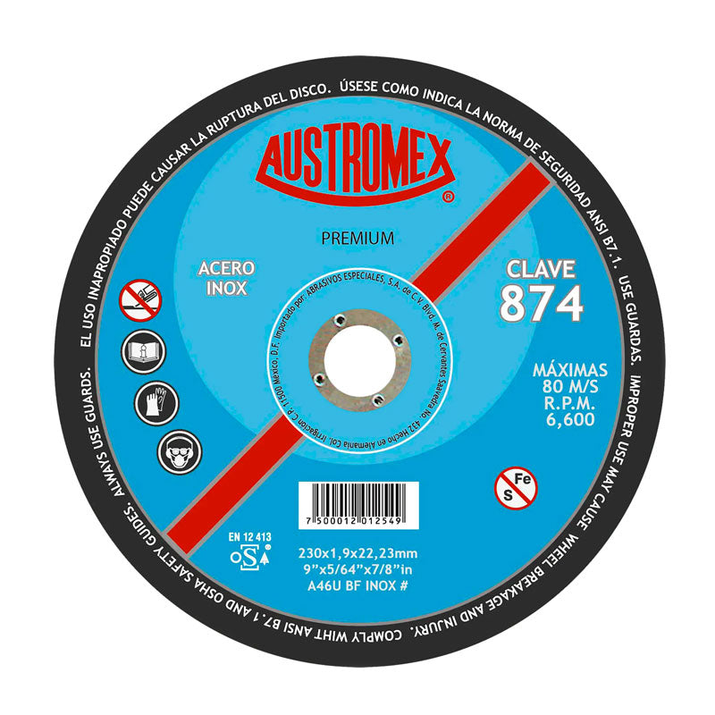 Disco abrasivo para corte de acero inoxidable de 9" x 5/64" x 7/8", Austromex