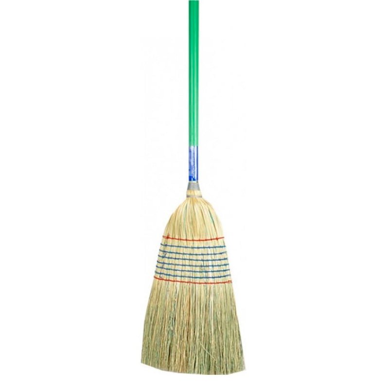 Esta escoba está fabricada con mijo, un material natural que es duradero y efectivo para barrer.