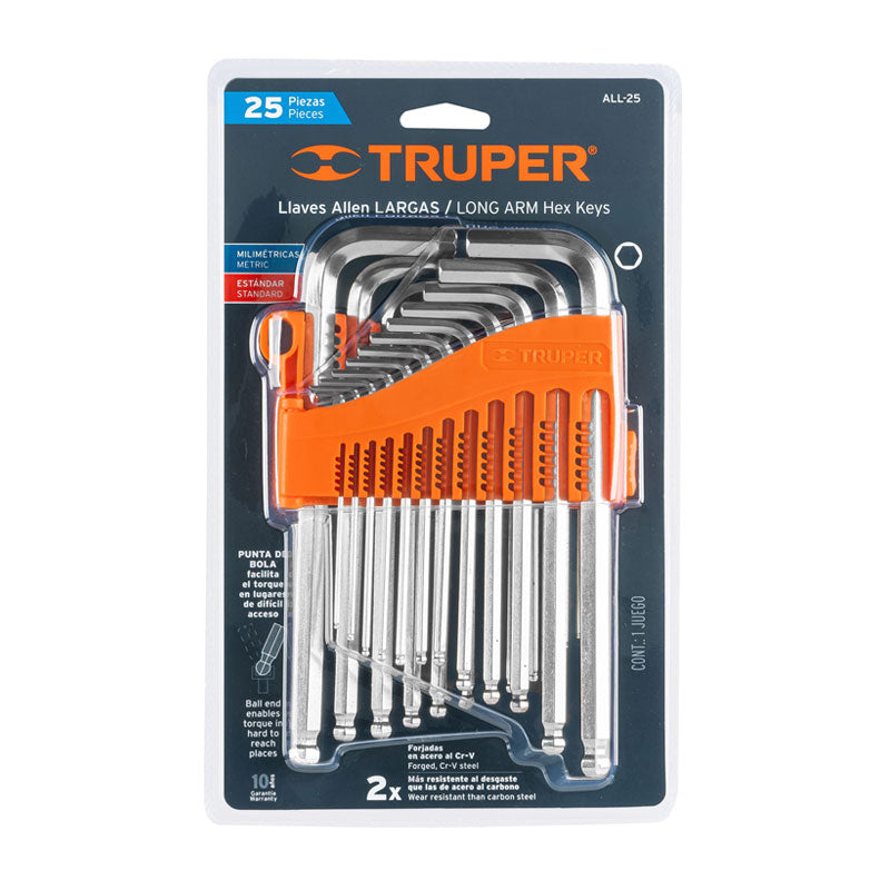 Juego 25 llaves allen largas std y mm punta bola,organizador, Truper