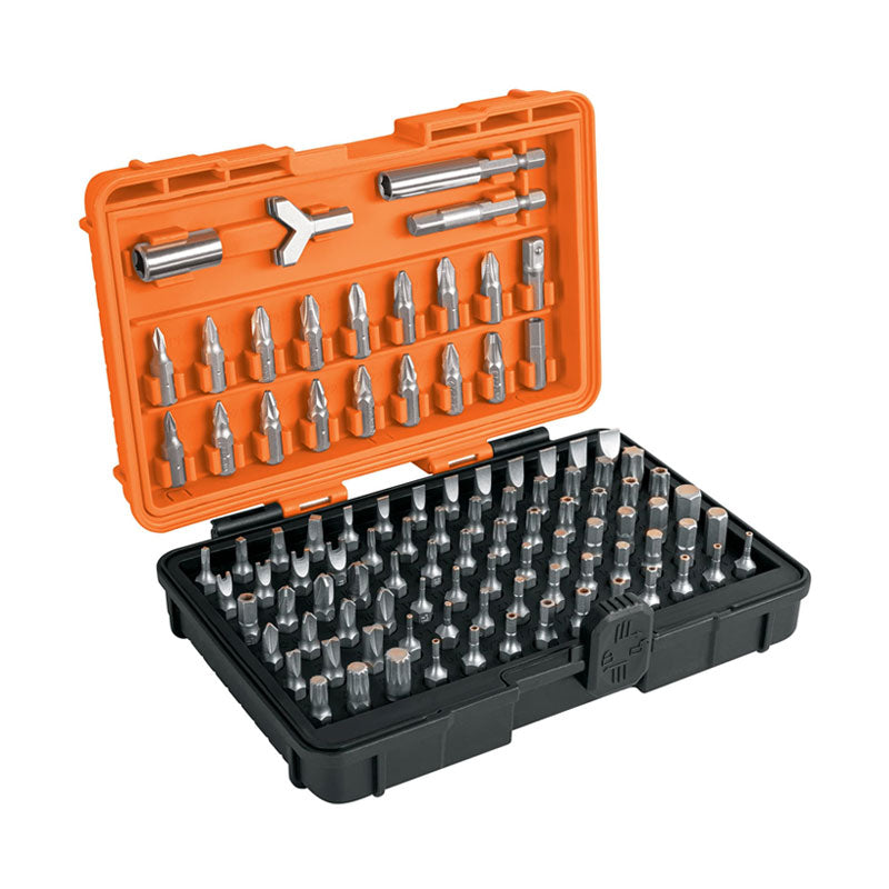 Incluye: 9 Puntas Planas, 8 Puntas de cruz, 9 Puntas Torx, 9 Puntas Torx con seguro, 8 Puntas Pozidriv, 3 Estrella de 12 puntas, 4 Puntas Cuadradas, 19 Puntas hexagonales, 12 Puntas hexagonales con seguro, 3 Puntas clutch, 4 Puntas spanner, 4 Puntas triwing, 3 Puntas torque set, 1 Extensión hexagonal magnética, 1 Adaptador de 1/4" hexagonal a 1/4" cuadrado, 1 Dado de 6.3 mm hexagonal a 6.3 mm cuadrado, 1 Extensión para dado, 1 Llave "Y".