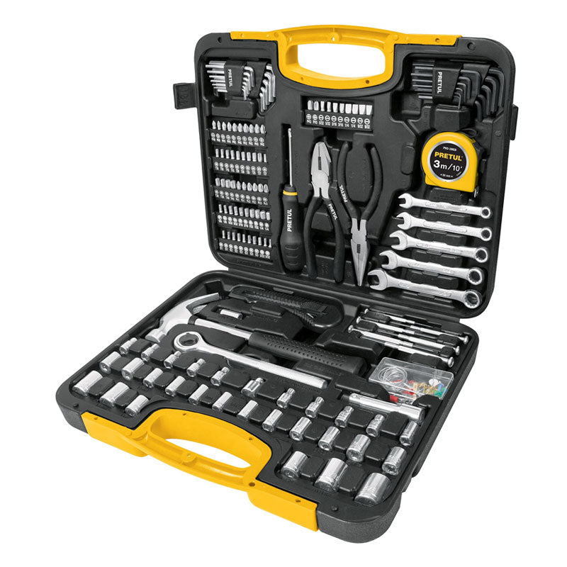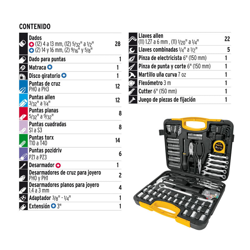 Incluye: 28 Dados: (12) 4 a 13 mm, (2) 14 y 16 mm, (12) 5/32" a 1/2", (2) 9/16" y 5/8", 1 Dado para puntas, 1 Matraca, 1 Disco giratorio, 12 Puntas de cruz: PH0 a PH3, 12 Puntas allen: 3/32" a 1/4", 8 Puntas planas: 5/32" a 9/32", 8 Puntas cuadradas: S1 a S3, 14 Puntas torx: T10 a T40, 6 Puntas pozidriv: PZ1 a PZ3, 1 Desarmador, 2 Desarmadores de cruz para joyero: PH0 y PH1, 4 Desarmadores planos para joyero: 1.4 a 3 mm, 1 Adaptador 3/8" x 1/4", 1 Extensión: 3", 22 Llaves allen: (11) 1.27 a 6 mm, (11) 1/20" a 1/4", 5 Llaves combinadas: 1/4" a 1/2", 1 Pinza de electricista: 6" (150 mm), 1 Pinza de punta y corte: 6" (150 mm), 1 Martillo uña curva: 7 oz, 1 Flexómetro: 3 m, 1 Cutter: 6" (150 mm), 1 Juego de pinzas de fijación.