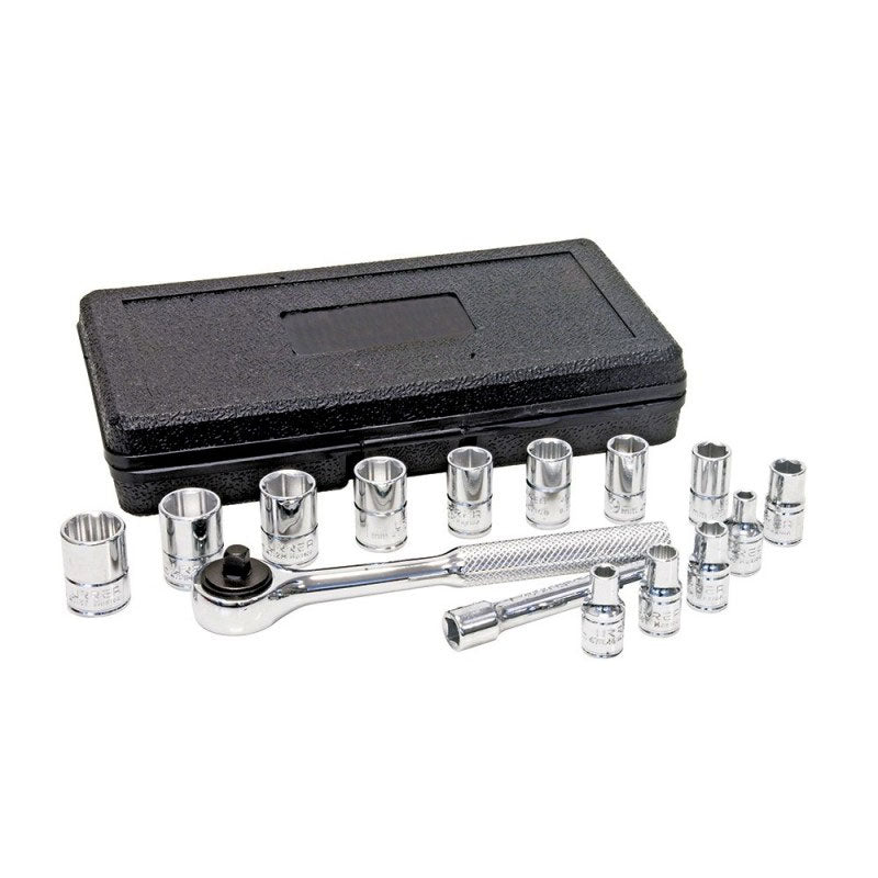 Juego de dados en pulgadas y métricos 12 y 6 puntas de 1/4" a 1/2", 4mm a 13mm con accesorios cuadro 1/4" en caja plástica