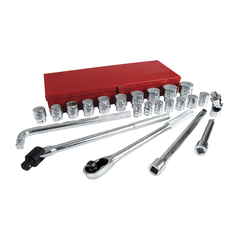 Incluye 24 dados, matraca, extensión 8” y 16”, mango articulado, nudo universal y mango tipo “L”.
