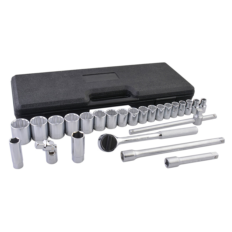 Incluye 18 dados desde 10 mm a 32 mm; 2 dados para bujía de 5/8" y 13/16"; matraca con cabeza redonda; barra corrediza; 2 extensiones de 5" y 10" y nudo universal.