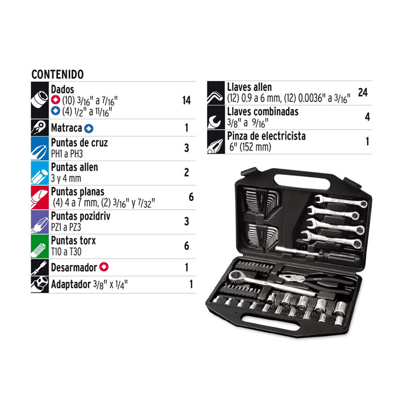 Incluye: 14 Dados: (10) 3/16" a 7/16", (4) 1/2" a 11/16", 1 Matraca, 3 Puntas de cruz: PH1 A PH3, 2 Puntas allen: 3 y 4 mm, 6 Puntas planas: (4) 4 a 7 mm, (2) 3/16" y 7/32", 3 Puntas pozidriv: PZ1 a PZ3, 6 Puntas torx: T10 a T30, 1 Desarmador, 1 Adaptador: 3/8" x 1/4", 24 Llaves allen: (12) 0.9 a 6 mm, (12) 0.0036" a 3/16", 4 Llaves combinadas: 3/8" a 9/16", 1 Pinzas de electricista: 6" (152 mm)
