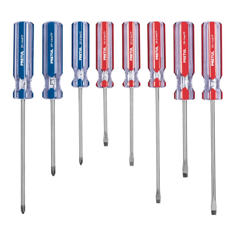 Incluye: 1 Desarmador plano de 3/16" x 3" (4.7x76.2mm), 1 Desarmador plano de 3/16" x 4" (4.7x101.6mm), 1 Desarmador plano de 3/16" x 6" (4.7x152.4mm), 1 Desarmador plano de 1/4" x 4" (6.3x101.6mm), 1 Desarmador plano de 1/4" x 6" (6.3x152.4mm), 1 Desarmador de cruz de 3/16" x 4" (4.7x101.6mm), 1 Desarmador de cruz de 1/4" x 4" (6.3x101.6mm), 1 Desarmador de cruz de 1/4" x 6" (6.3x152.4mm).