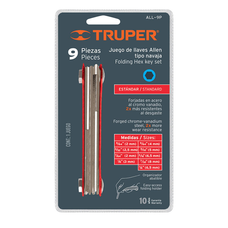 Juego de 9 llaves allen std tipo navaja, cuerpo de lámina, Truper