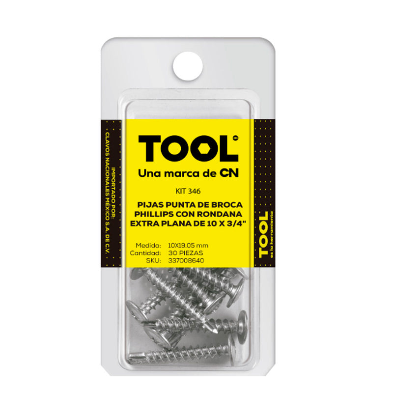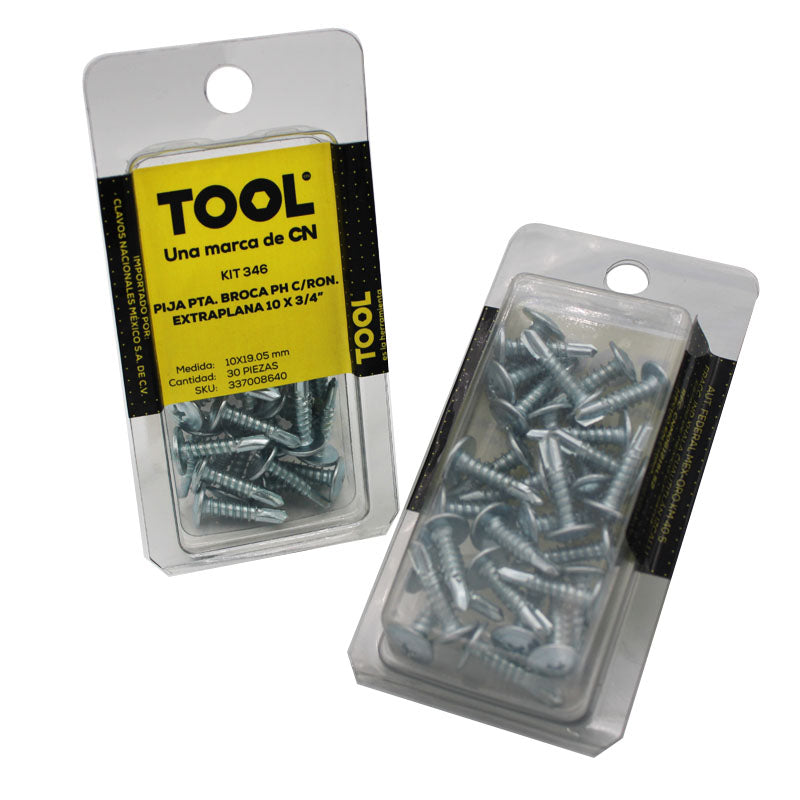 Acabado: Galvanizado electrolítico (ASTM B-633). ? Kit 346 Pija Pta.Broca Ph C/Ron.Extraplana 10X