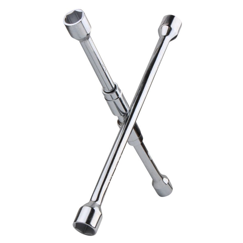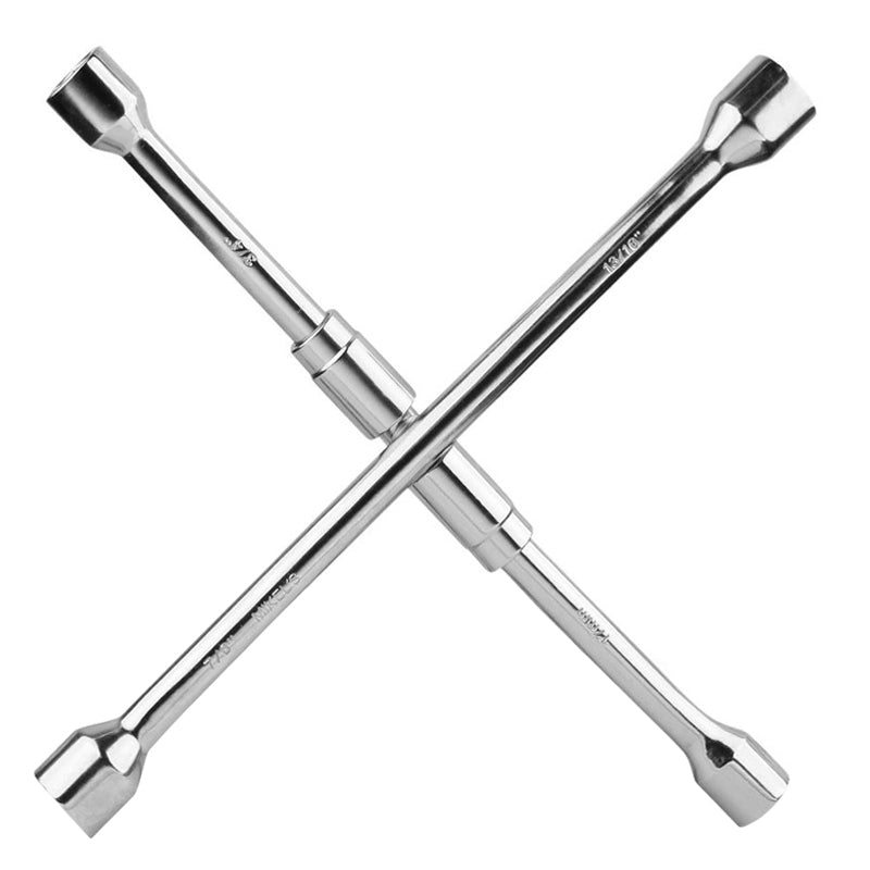 Llave de cruz plegable universal de 14” con 4 bocas de; 17 mm, 3/4" (19 mm), 13/16” (20,6 mm) y 7/8” (22,2 mm), cuerpo de 5/8" (15,8 mm) fabricado de acero forjado al alto carbono. Ideal para cualquier tuerca o birlo de auto.