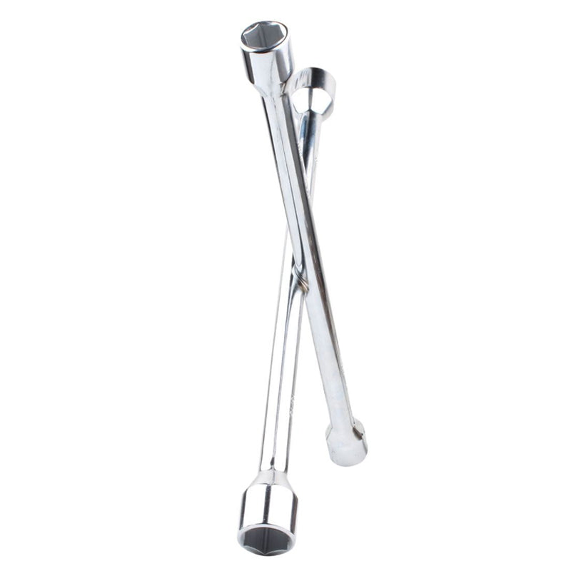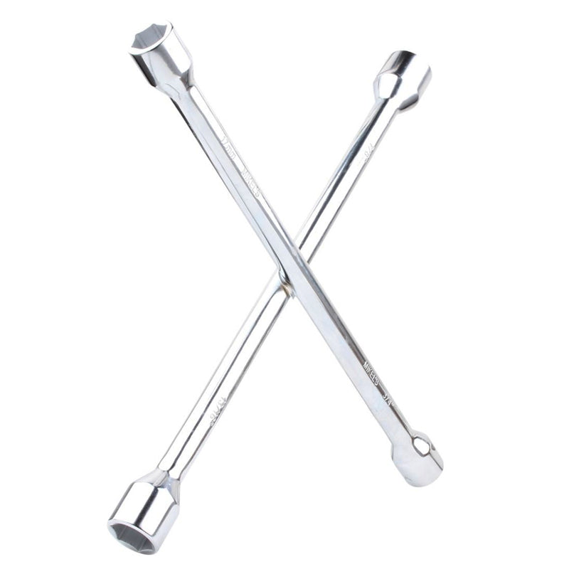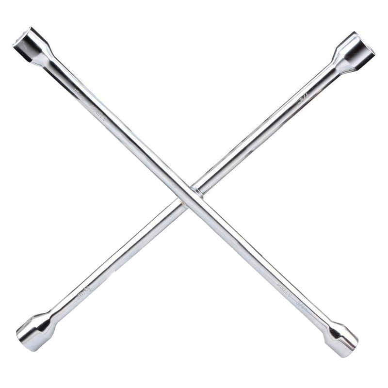 Llave de cruz universal de 20” con 4 bocas de; 11/16", (17 mm), 3/4" (19 mm), 13/16" (20.6 mm) y 7/8" (22.2 mm), cuerpo de 5/8" (15,8 mm) fabricado de acero forjado al alto carbono. Ideal para cualquier tuerca o birlo de auto.