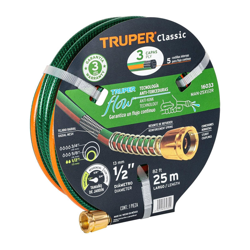 Manguera 1/2" reforzada 3 capas 25 m conexiones de metal, Truper