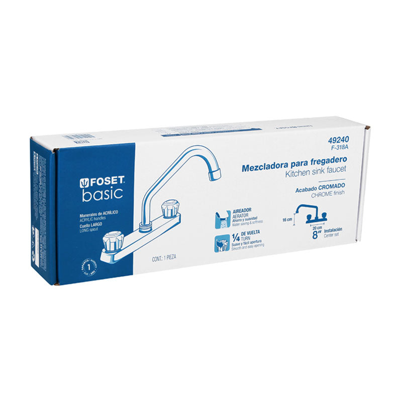 Mezcladora 8" P/Fregadero, Cuello Largo, Manerales Acrílico, Foset