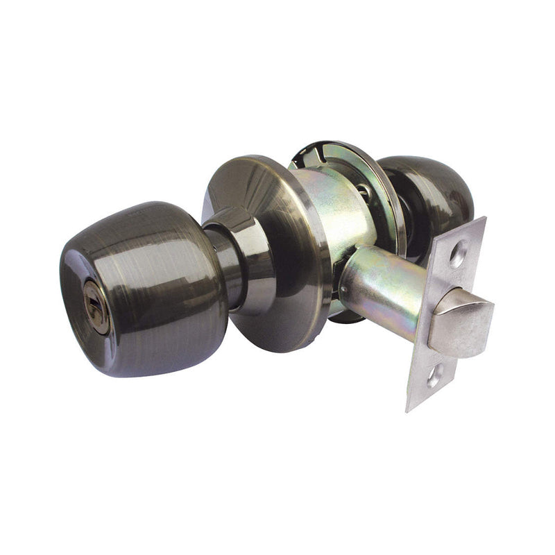Al girar cualquiera de las dos perillas se retrae el pestillo. Al oprimir el botón de la perilla interior, se fija la perilla exterior. Al girar la perilla interior o la llave, salta el botón automáticamente para abrir. Perilla interior siempre libre.