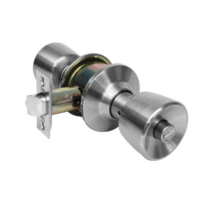Al girar cualquiera de las dos perillas se retrae el pestillo. Al oprimir el botón de la perilla interior, se fija la perilla exterior. Al girar la perilla interior o la llave, salta el botón automáticamente para abrir. Perilla interior siempre libre.