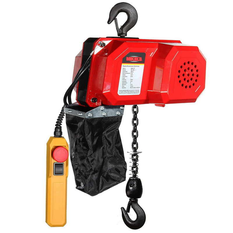 Polipasto eléctrico ideal para elevar de manera rápida y práctica cargas pesadas con motor eléctrico, carcasa de acero, cadenas galvanizadas de alta resistencia al desgaste y corrosión, construcción robusta contra golpes externos, ganchos de acero forjado, sujeción ultra fuerte con cierre de seguridad y sistema de freno de seguridad integrado.