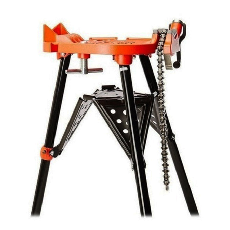 Prensa de cadena para tubería, con patas plegables integrales que facilitan su transporte y montaje, ganchos para colgar herramientas y una base que sobresale de las patas delanteras para que las herramientas puedan desplazarse sin obstrucciones. Diseño de base optimizado para maximizar el área de trabajo, útil orejeta para fijar la pinza de tierra para soldadura, robusta cadena de pata y bandeja de herramientas duradera.