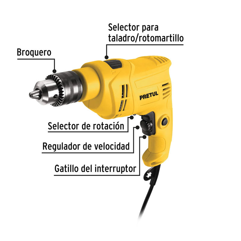 Diseñado con función de taladro y rotomartillo con velocidad variable reversible, mango ergonómico con grip antiderrapante y con un mango auxiliar giro de 360° para mayor comodidad y mayor control en la perforación.