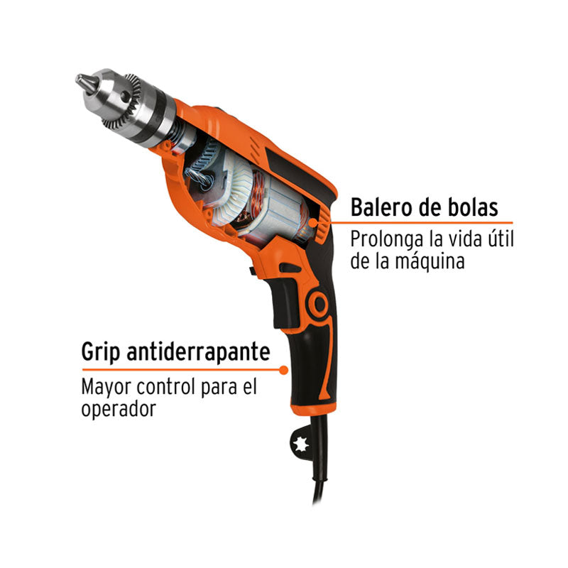 Diseñado con función de taladro y rotomartillo con velocidad variable reversible, mango ergonómico con grip antiderrapante y con un mango auxiliar giro de 360° para mayor comodidad y mayor control en la perforación.